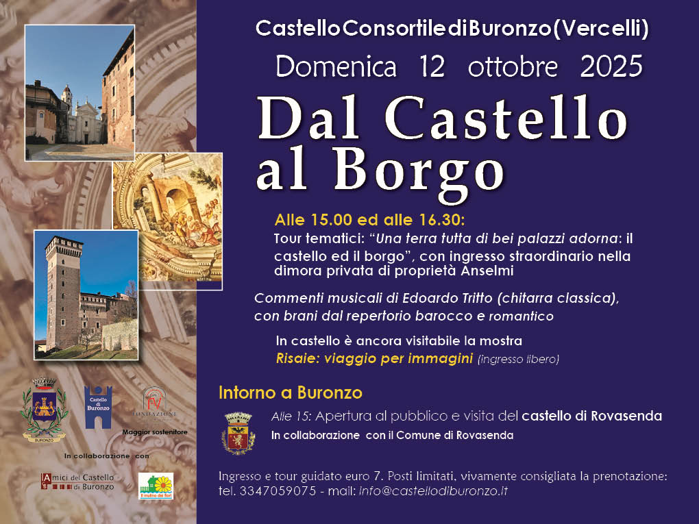 Come per le altre date della rassegna, l’esperienza di visita a Buronzo potrà essere arricchita dalla proposta di un altro luogo di storia ed arte: alle 15.00 verrà aperto al pubblico il castello antico di Rovasenda, per una visita in linea con il tema della giornata, “Castelli e borghi”.